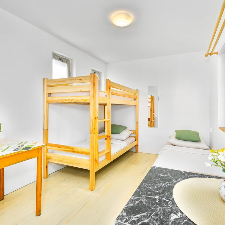 Třílůžková chatka s jednolůžkem a palandou.